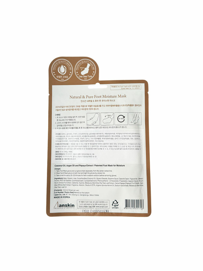 Изготовитель: «PNB Co.Ltd. », КОРЕЯ, РЕСПУБЛИКА, 231, Yeolumul-ro, Seo-gu, Incheon. Маска-носочки ANSKIN Natural & Pure Foot Moisture Mask (16 мл) — это расслабляющая спа-процедура для интенсивного смягчения и увлажнения стоп. Удобный формат позволяет активной эссенции глубоко впитаться, возвращая коже гладкость и ухоженный вид. Ключевые активы — мочевина и экстракт алоэ вера. Мочевина эффективно удерживает влагу и помогает размягчить сухие участки, делая пяточки мягкими и нежными. Салициловая кислота деликатно выравнивает рельеф, а алоэ успокаивает и дарит ощущение комфорта. Маска снимает усталость после долгого дня. Результат: идеально гладкие, напитанные и мягкие стопы. Способ применения: Вымойте и высушите ноги. Наденьте маску-носочки. Оставьте на 30 минут для воздействия. Снимите носочки, остатки средства вмассируйте в кожу до полного впитывания.