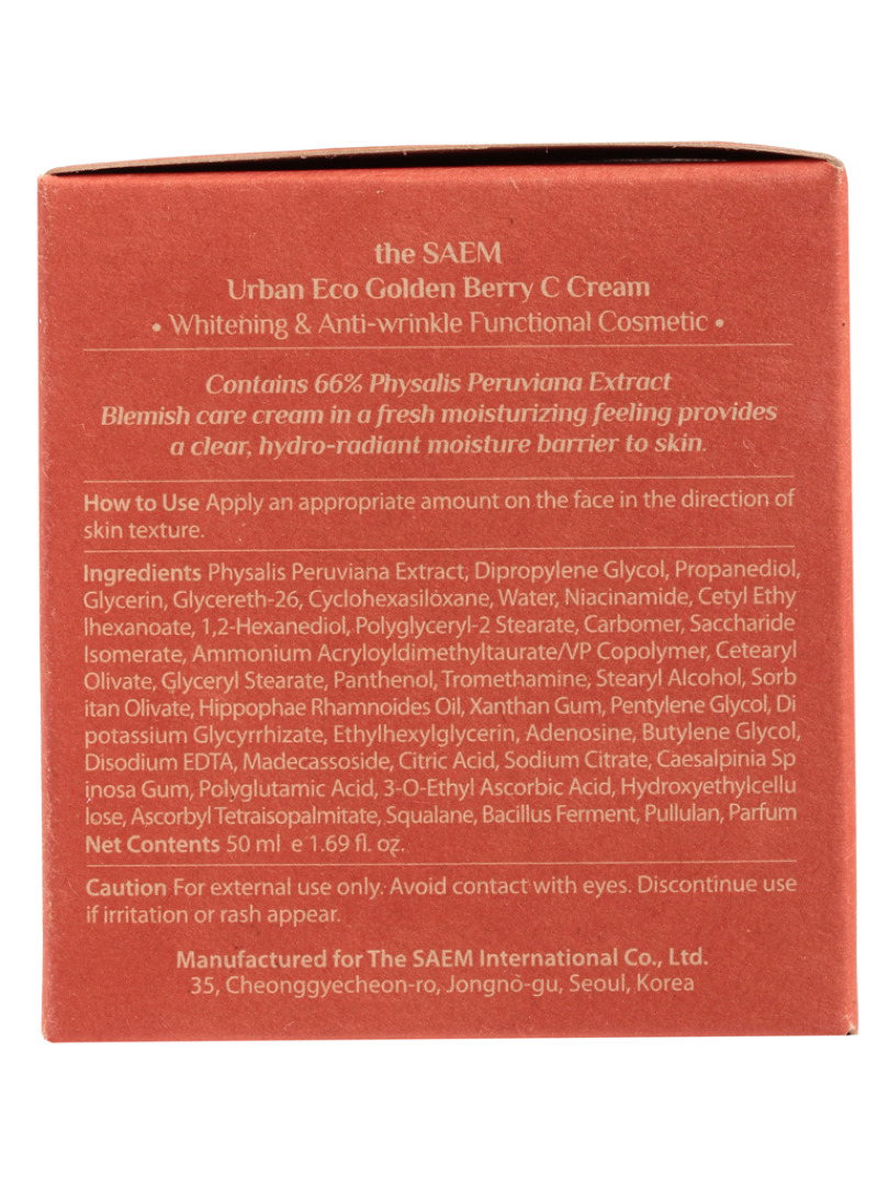 Изготовитель: THE SAEM INTERNATIONAL CO.LTD., КОРЕЯ, РЕСПУБЛИКА, 10F, 35, Cheonggyecheon-ro, Jongno-gu, Seoul. Средство c экстрактом физалиса уменьшает образование морщин и пятен, а также имеет осветляющий эффект и насыщает ее витаминами A и C. Крем содержит 66 % экстракта перуанской золотой ягоды (физалиса). Крем оказывает успокаивающее, увлажняющее и осветляющее действие. Способ применения: на последнем этапе ухода за кожей нанесите крем.