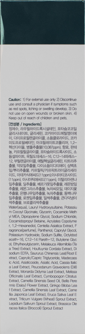 Water, Lauryl Hydroxysultaine, Potassium Cocoyl Glycinate, Glycerin, Cocamide Methyl MEA, Dipropylene Glycol, Sodium Chloride, Cocamidopropyl Betaine, Acrylates Copolymer, 1,2-Hexanediol, Centella Asiatica Extract, Fragrance, Panthenol, Caprylyl Glycol, Potassium Hydroxide, Sodium Sulfite, Octyldodeceth-16, C12-14 Pareth-12, Butylene Glycol, Ethylhexylglycerin, Melaleuca Alternifolia (Tea Tree) Extract, Houttuynia Cordata Extract, Disodium EDTA, Saururus Chinensis Leaf/Root Extract, Caprylic/Capric Triglyceride, Madecassic Acid, Asiaticoside, Asiatic Acid, Cassia Italica Leaf Extract, Peucedanum Graveolens (Dill) Extract, Monarda Didyma Leaf Extract, Melissa Officinalis Leaf Extract, Cymbopogon Citratus Extract, Camellia Sinensis Seed Oil, Bellis Perennis (Daisy) Flower Extract, Ginkgo Biloba Leaf Extract, Camellia Sinensis Leaf Extract, Camellia Japonica Leaf Extract, Eruca Sativa Leaf Extract, Triticum Vulgare (Wheat) Sprout Extract, Lepidium Sativum Sprout Extract, Brassica Oleracea Italica (Broccoli) Spro
