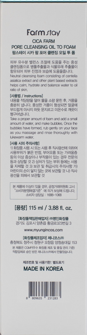 Изготовитель: MYUNGIN COSMETICS CO. LTD., 441-4, Gongneungcheon-ro, Ilsandong-gu, Goyang-si, Gyeonggi-do, РЕСП. КОРЕЯ. Гидрофильное масло-пенка идеально удаляет остатки макияжа и загрязнений, дарит ощущение комфорта и свежести, подготавливает кожу для дальнейшего ухода. Масло-пенка подойдет для комбинированной, жирной, проблемной, чувствительной и раздраженной кожи. Экстракт центеллы азиатской эффективно успокаивает, помогает в борьбе с поврежденными участками кожи, ускоряет процессы восстановления. Способ применения: выдавить необходимое количество средства на ладонь. Нанести субстанцию на сухую кожу лица и аккуратно помассировать, удаляя загрязнения. Затем смочить руки и снова помассировать кожу, чтобы масло преобразовалось в пенку. Завершив процесс очищения, тщательно смыть пенку тёплой водой.