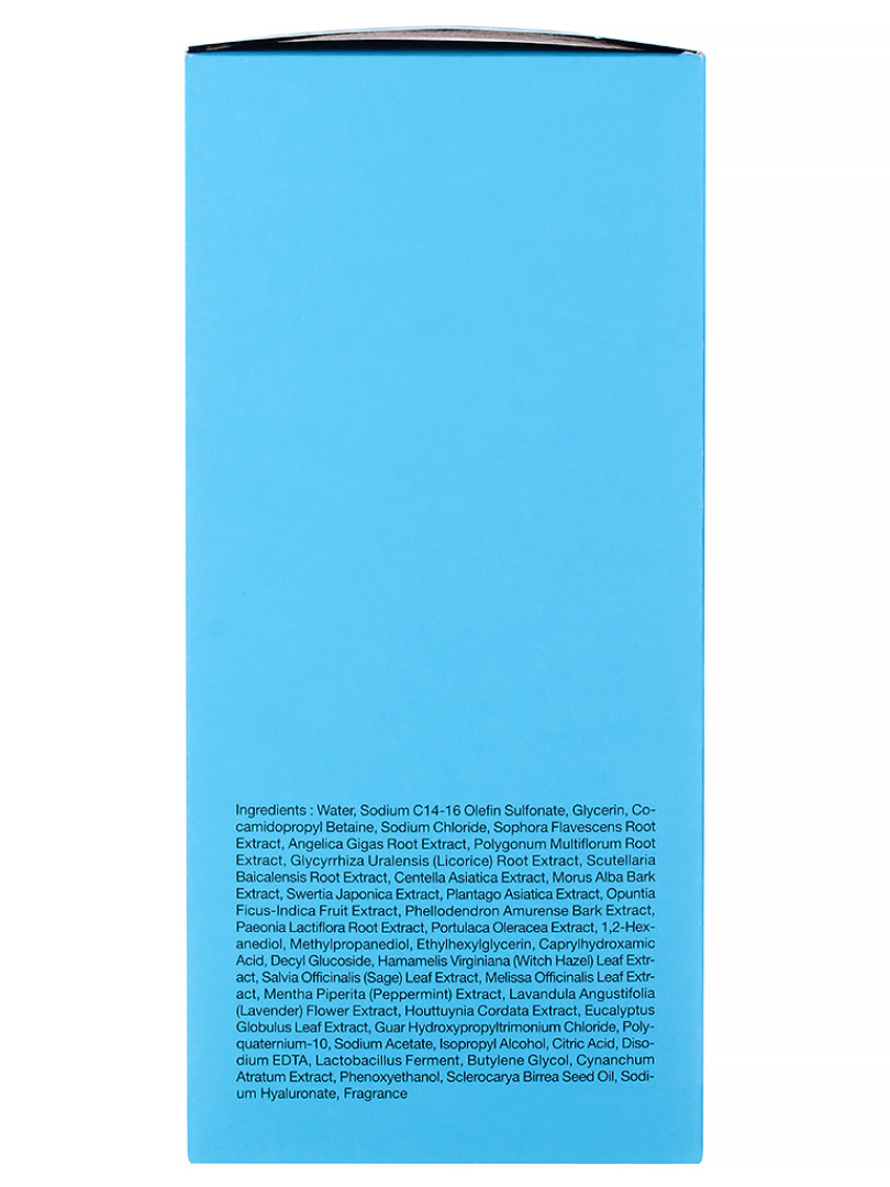 Water, Sodium C14-16 Olefin Sulfonate, Cocamidopropyl Betaine, Sodium Chloride, Glycerin, Sophora Flavescens Root Extract, Angelica Gigas Root Extract, Polygonum Multiflorum Root Extract, Houttuynia Cordata Extract, "Glycyrrhiza Uralensis (Licorice) Root, Extract", Scutellaria Baicalensis Root Extract, Centella Asiatica Extract, Morus Alba Bark Extract, Swertia Japonica Extract, Plantago Asiatica Extract, Opuntia Ficus-Indica Fruit Extract, Phellodendron Amurense Bark Extract, Paeonia Lactiflora Root Extract, Portulaca Oleracea Extract, 1,2-Hexanediol, Methylpropanediol, Ethylhexylglycerin, Caprylhydroxamic Acid, Decyl Glucoside, 1,2-Hexanediol, "Hamamelis Virginiana (Witch Hazel), Leaf Extract", Salvia Officinalis (Sage) Leaf Extract, Melissa Officinalis Leaf Extract, Mentha Piperita (Peppermint) Extract, "Lavandula Angustifolia (Lavender), Flower Extract", Eucalyptus Globulus Leaf Extract, Fragrance, "Guar Hydroxypropyltrimonium, Chloride", Polyquaternium-10, Sodium Acetate, Isopropyl Alcohol, Citric Acid, Disodium EDTA, Lactobacillus Ferment, Butylene Glycol, Cynanchum Atratum Extract, Phenoxyethanol, Sclerocarya Birrea Seed Oil, Sodium Hyaluronate