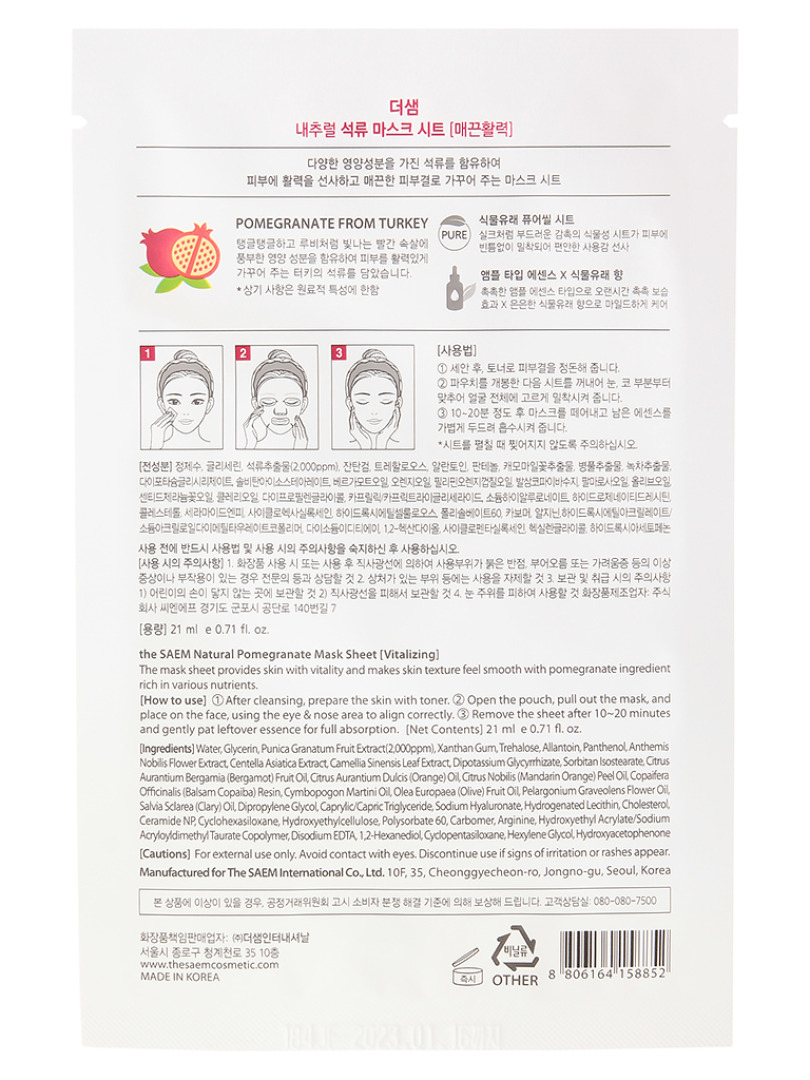 Изготовитель: THE SAEM INTERNATIONAL CO.LTD., КОРЕЯ, РЕСПУБЛИКА, 10F, 35, Cheonggyecheon-ro, Jongno-gu, Seoul. Тканевая маска на основе экстракта граната мгновенно стабилизирует липидный баланс кожи и предотвращает пересыхание. Обладает успокаивающим действием, минимизирует глубину морщин, восстанавливает эластичность и упругость кожи. Применение: приложите маску к очищенной коже, оставьте на 20-25 минут. После распределите остатки жидкости по коже лица и шее.