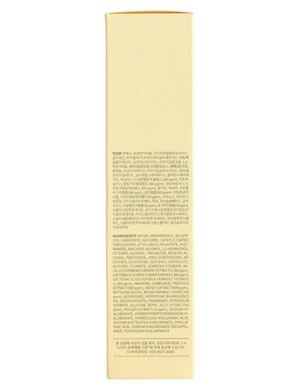 Water, Propanediol, Dicaprylyl Carbonate, Glycerin, Caprylic/Capric Triglyceride, Ethylhexyl Palmitate, Niacinamide, Arachidyl Alcohol, 1,2-Hexanediol, Cetearyl Alcohol, Trehalose, Behenyl Alcohol, Panthenol, Vinyl Dimethicone, Arachidyl Glucoside, Glyceryl Caprylate, Glyceryl Stearate, Sorbitan Stearate, Bacillus/Soybean Ferment Extract, Lactobacillus/Rye Flour Ferment, Lactobacillus/Soymilk Ferment Filtrate, Arginine, Carbomer, Propolis Extract, Honey Extract, Butylene Glycol, Bifida Ferment Lysate, Adenosine, Disodium Edta, Hippophae Rhamnoides Oil, Potassium Sorbate, Glucose, Royal Jelly Extract, Pollen Extract, Sodium Hyaluronate, Hydroxypropyltrimonium Hyaluronate, Hydrolyzed Hyaluronic Acid, Sodium Acetylated Hyaluronate, Hyaluronic Acid, Sodium Hyaluronate Crosspolymer, Potassium Hyaluronate, Fragrance