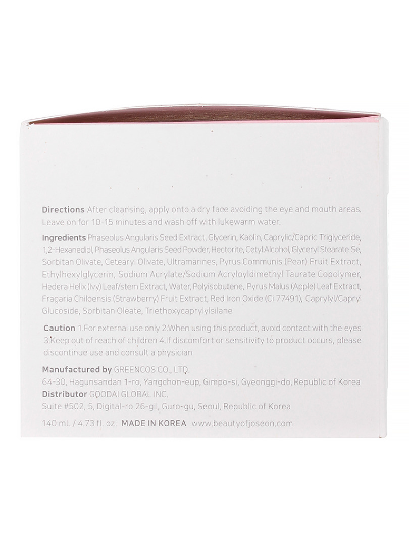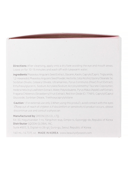 Изг-ль: GREENCOS CO., LTD. 64-30 Hagunsan dan 1-ro, Yangchon-eup, Gimpo-si, Gyeonggi-do, Республика Корея. Очищающая глиняная маска с красной фасолью удаляет загрязнения из пор, смывает ороговевшие частицы, сужает расширенные поры и мягко отшелушивает. Снижает температуру кожи, освежая и охлаждая. Формула основана на 30% экстракте красной фасоли и содержит каолин, пудру красной фасоли, экстракты груши, плюща, яблока и клубники. Способ применения: нанесите на чистую сухую кожу после умывания равномерным слоем, избегая области вокруг глаз и губ. Через 5-10 минут помассируйте и смойте водой.