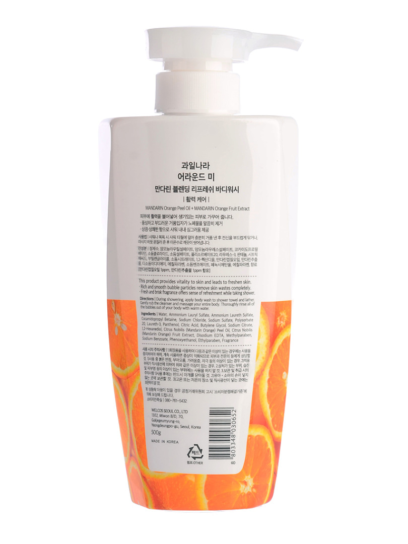 Изготовитель: Welcos Co., LTD., 21-12, Toegyegongdan 1-gil, Chuncheon-si, Gangwon-do, Республика Корея. Гель для душа содержит экстракт мандарина и масло кожуры мандарина, которое тонизирует и укрепляет кожу тела. Оздоровительное очищение тела с богатыми витаминами и минералами (масло кожуры мандарина 0,01 ppm, экстракт мандарина 1 ppm). Богатая и нежная пена очищает кожу тела от загрязнений без раздражения. Средство делает кожу подтянутой и упругой, снимает стресс. Свежий, сочный аромат мандарина поднимает настроение и освежает. Способ применения: нанесите воздушную пену на тело и смойте теплой водой.
