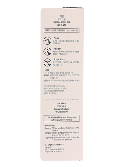 Изготовитель: "THE SAEM INTERNATIONAL CO.LTD"., КОРЕЯ, РЕСПУБЛИКА, 10F, 35, Cheonggyecheon-ro, Jongno-gu, Seoul. Многофункциональный карандаш для бровей 3 в 1 (грифель, оттеночная пудра, щеточка). Коричневые оттенки придают натуральный цвет бровям. Тонкая овальная форма карандаша создает четкий контур. Оттеночная пудра заполняет пространство между волосками, делая их визуально густыми. Круглая щеточка создает аккуратную форму бровям. Способ применения: с помощью щеточки расчешите брови, создайте контур бровям карандашом и заполните внутреннее пространство оттеночной пудрой.