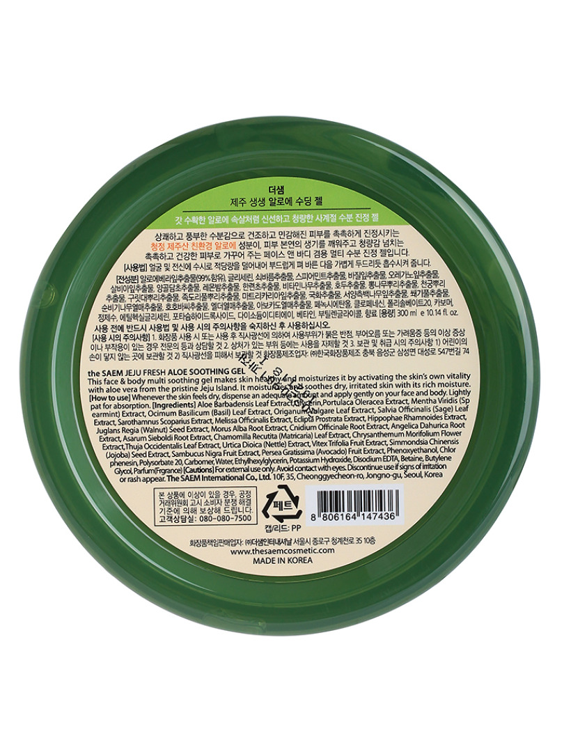 Изг-ль: «THE SAEM INTERNATIONAL CO.LTD. », КОРЕЯ, РЕСПУБЛИКА, 10F, 35, Cheonggyecheon-ro, Jongno-gu, Seoul. Гель наполняет кожу влагой, успокаивает её, снимает раздражения, избавляет от шелушений, прекрасно справляется с солнечными ожогами и пересушенностью кожи после загара. Алоэ-гель можно использовать даже для ухода за детской нежной кожей – он гипоаллергенен и не вызывает раздражений. Крем-гель также можно применять в качестве увлажняющей базы под макияж, которая сохраняет чувство свежести в течение долгих часов, а также надежно фиксирует декоративную косметику. Способ применения: нанести гель на кожу лица, в том числе и на кожу век, или тела, на волосы или ногти.
