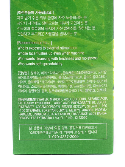 Изг-ль: GREENCOS Co.Ltd., Республика Корея, 64-30, Hagunsandan 1-ro, Yangchon-eup, Gimpo-si, Gyeonggi-do. Пенка для умывания с экстрактом алоэ. Экстракт алоэ нежно увлажняет, предотвращает появление прыщей, удерживает влагу в коже, не оставляет сухость и стягивание после умывания. Придает коже ощущение легкости и расслабления. Подходит для любого типа кожи. Применение: необходимое количество средства вспенить с теплой водой, вымыть лицо массирующими движениями и смыть теплой водой.