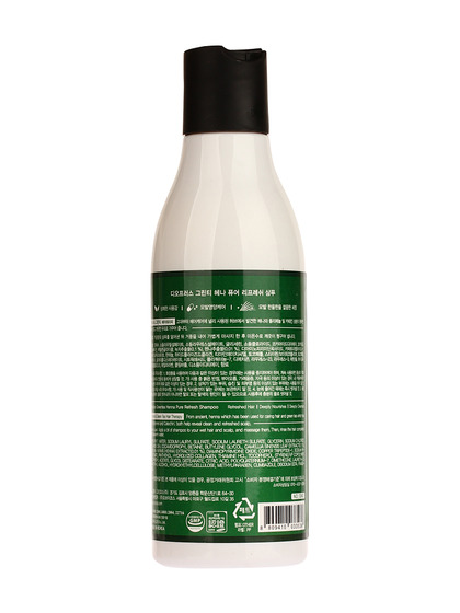 Изг-ль: GREENCOS Co.Ltd., Республика Корея, 64-30, Hagunsandan 1-ro, Yangchon-eup, Gimpo-si, Gyeonggi-do. Смягчающий шампунь для волос с зеленым чаем и хной. Витаминизирует луковицу и волос по всей длине, заряжая энергией и придавая блеск. Уменьшает перхоть, укрепляет корни волос и отлично кондиционирует волосы, придавая им густоту и блеск. Способствует улучшению качества волос, повышает их эластичность и прочность, благоприятно влияет на поврежденные и секущиеся волосы, защищает от преждевременного выпадения волос. Применение: нанести на мокрые волосы, втереть в кожу головы и волосы, оставить на 1 мин, смыть теплой водой.
