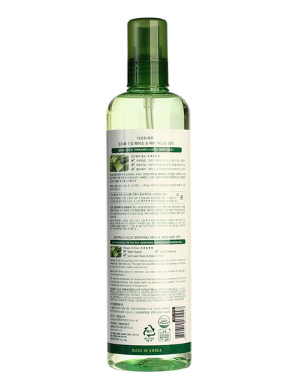 Изготовитель: GREENCOS Co.Ltd., Республика Корея, 64-30, Hagunsandan 1-ro, Yangchon-eup, Gimpo-si, Gyeonggi-do. Успокаивающий спрей для лица и тела, на основе экстракта алоэ, является идеальным природным тоником для кожи. Уникальный состав алоэ делает его одним из универсальных косметических ингредиентов. Спрей на основе алоэ прекрасно подходит для ухода за кожей всех возрастов и типов. Спрей оказывает активное успокаивающее, увлажняющее и заживляющее действие, снимает раздражение, шелушение, покраснение, устраняет ощущение зуда и стянутости кожи. Способ применения: Распылите на расстоянии 15-20 см. от лица