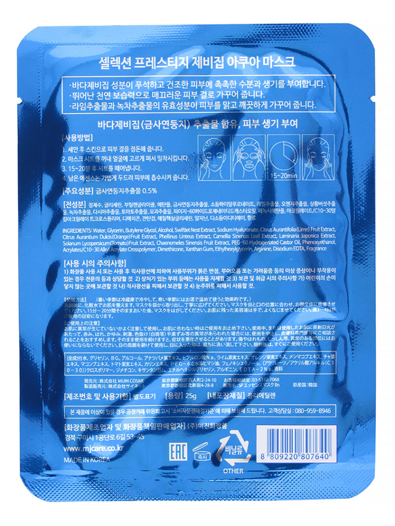 Изготовитель: «MIJIN COSMETICS », Южная Корея. 53-45, 1 Gongdan-ro 6 Gil, Gumi-si, Gyeongsangbuk-do. Тканевые маски с высококачественными активными компонентами обеспечивают профессиональный уход за кожей лица – оказывают эффективный антивозрастной уход и сохраняют молодость кожи.Рецептура эссенции маски способствует более глубокому проникновению активных ингредиентов, увлажнению и питанию кожи. Все маски содержат гиалуроновую кислоту для интенсивного увлажнения кожи. Маска с экстрактом ласточкиного гнезда глубоко увлажняет, немного осветляет и придает сияние. Маска прекрасно подходит для всех типов кожи, особенно рекомендуется для сухой и нормальной. Экстракт легко проникает в глубокие слои эпидермиса наполняя их влагой и полезными элементами, которые делают кожу более молодой и эластичной. Способ применения: На предварительно очищенную и тонизированную кожу лица нанести маску, аккуратно разгладив и распределив ее. Оставить маску на 15-20 минут. Остатки невпитавшейся эссенции вмассировать в кожу легкими движениями.