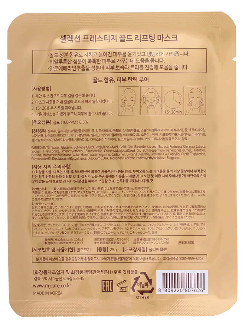 Изготовитель: MIJIN COSMETICS, Республика Корея, 53-45, 1 Gongdan-ro 6-gil, Gumi-si Gyeongsangbuk-do. Тканевые маски с высококачественными активными компонентами обеспечивают профессиональный уход за кожей лица – оказывают эффективный антивозрастной уход и сохраняют молодость кожи. Рецептура эссенции маски способствует более глубокому проникновению активных ингредиентов, увлажнению и питанию кожи. Все маски содержат гиалуроновую кислоту для интенсивного увлажнения кожи. Маска с экстрактом золота и гиалурона эффективно подтягивает кожу лица; омолаживает, делая кожу упругой и эластичной; сокращает и разглаживая морщины. При регулярном применении маски, кожа приобретает свежий и сияющий вид, кожа становится молодой и ухоженной. Способ применения: На предварительно очищенную и тонизированную кожу лица нанести маску, аккуратно разгладив и распределив ее. Оставить маску на 15-20 минут. Остатки невпитавшейся эссенции вмассировать в кожу легкими движениями.
