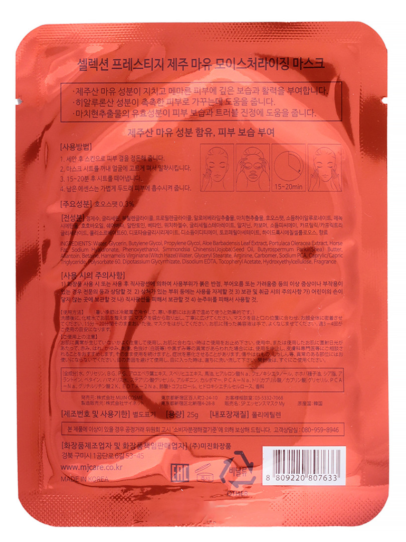 Изготовитель: «MIJIN COSMETICS », Южная Корея. 53-45, 1 Gongdan-ro 6 Gil, Gumi-si, Gyeongsangbuk-do. Тканевые маски с высококачественными активными компонентами обеспечивают профессиональный уход за кожей лица – оказывают эффективный антивозрастной уход и сохраняют молодость кожи.Рецептура эссенции маски способствует более глубокому проникновению активных ингредиентов, увлажнению и питанию кожи. Все маски содержат гиалуроновую кислоту для интенсивного увлажнения кожи. Маска с ферментированным лошадиным жиром увлажняет, повышает эластичность и упругость кожи, устраняет шелушения, питает, смягчает, выравнивает тон, защищает от вредного воздействия окружающей среды, восстанавливает и ускоряет регенерацию. Способ применения: На предварительно очищенную и тонизированную кожу лица нанести маску, аккуратно разгладив и распределив ее. Оставить маску на 15-20 минут. Остатки невпитавшейся эссенции вмассировать в кожу легкими движениями.