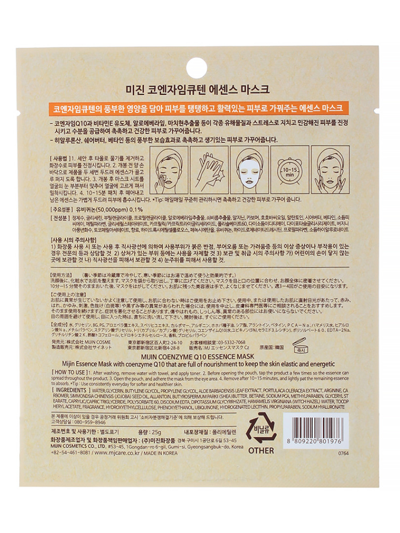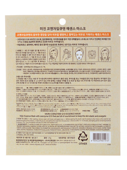 Изготовитель: MIJIN COSMETICS, Республика Корея, 53-45, 1 Gongdan-ro 6-gil, Gumi-si Gyeongsangbuk-do. В состав эссенции входит знаменитый компонент молодости - коэнзим Q10, который помогает коже оставаться упругой и эластичной, не смотря на возраст! Также маска с коэнзимом рекомендуется людям с чувствительной кожей, ведь он помогает повысить собственные защитные функции кожи и помочь ей противостоять неблагоприятным факторам внешней среды. Способ применения: после очищения и тонизирования кожи приложите маску на 10-15 мин., затем удалите и вмассируйте оставшуюся эссенцию в кожу.