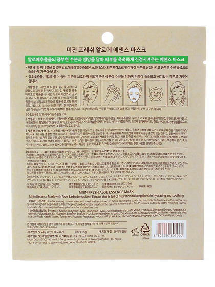 Изготовитель: MIJIN COSMETICS, Республика Корея, 53-45, 1 Gongdan-ro 6-gil, Gumi-si Gyeongsangbuk-do. Маска с экстрактом алоэ успокаивает воспаленную кожу, снимает раздражение, подсушивает и лечит воспаления и прыщи. Кроме того, алоэ обладает отличными увлажняющими и питательными свойствами. Такая маска отлично подойдет для устранения неприятных последствий воздействия окружающей среды, а также обладателям чувствительной, проблемной и сухой кожи.Способ применения: после очищения и тонизирования кожи приложите маску на 10-15 мин., затем удалите и вмассируйте оставшуюся эссенцию в кожу.