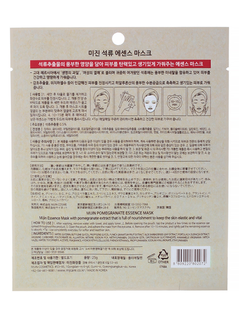 Изготовитель: MIJIN COSMETICS, Республика Корея, 53-45, 1 Gongdan-ro 6-gil, Gumi-si Gyeongsangbuk-do. Гранатовая маска заряжает кожу коктейлем из питательных веществ и витаминов, делая ее гладкой, ровной и сияющей. Экстракт граната - действующее средство в борьбе со старением кожи, он обеспечивает эластичность, упругость и отличный тонус вашей коже! Способ применения: после очищения и тонизирования кожи приложите маску на 10-15 мин., затем удалите и вмассируйте оставшуюся эссенцию в кожу.