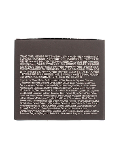 Methyl Perfluoroisobutyl Ether, Bentonite, Glycerin, Disodium Cocoamphodiacetate, Butylene Glycol, Kaolin, Acrylates Copolymer, Cocamidopropyl Betaine, Lauramide DEA, Sodium Lauryl Sulfate, Sodium Chloride, Xanthan Gum, Carbonated Water, Charcoal Powder, Illite, Montmorillonite, Triethanolamine, Prunus Salicina Fruit Extract, Glycine Soja (Soybean) Seed Extract, Sesamum Indicum (Sesame) Seed Extract, Oryza Sativa (Rice) Extract, Vaccinium Angustifolium (Blueberry) Fruit Extract, Rubus Fruticosus (Blackberry) Leaf Extract, Solanum Melongena (Eggplant) Fruit Extract, Ribes Nigrum (Black Currant) Seed Extract, Salvia Hispanica Seed Extract, Nelumbo Nucifera Flower Water, Eucalyptus Globulus Leaf Extract, Origanum Vulgare Leaf Extract, Hibiscus Sabdariffa Flower Extract, Hedera Helix (Ivy) Leaf Extract, Camellia Sinensis Leaf Extract, Linum Usitatissimum (Linseed) Seed Extract, Pinus Sylvestris Leaf Extract, Sodium Hyaluronate, Dipropylene Glycol, Chlorphenesin, Disodium EDTA, Hexylene Glycol, Allantoin, Citrus Aurantium Bergamia (Bergamot) Peel Oil, 1,2-Hexanediol, Fragrance