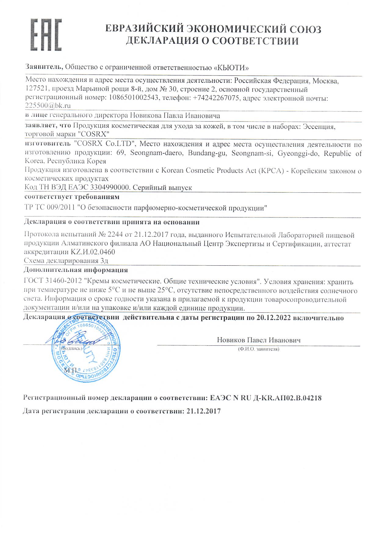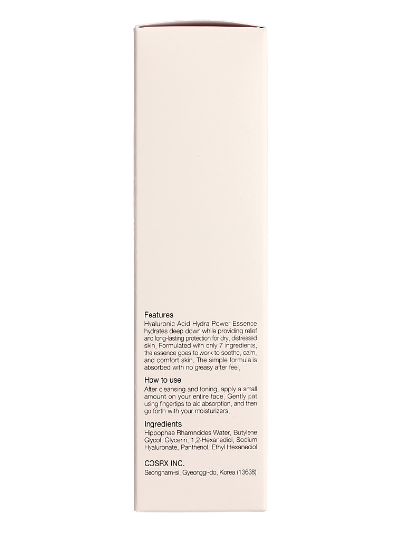 Изготовитель: COSRX Co.LTD., КОРЕЯ, РЕСПУБЛИКА, 69, Seongnam-daero, Bundang-gu, Seongnam-si, Gyeonggi-do. Мощные увлажняющие свойства эссенции с высокой концентрацией гиалуроновой кислоты обеспечивают мгновенное и глубокое насыщение влагой каждой клеточки кожи. Эссенция подходит для всех типов кожи, особенно рекомендуется для сухой, раздраженной и чувствительной. Возрастная группа: 25+. Средство оказывает противовспалительное действие, успокаивает кожу, снимает покраснения, ускоряет заживление микроповреждений и раздражений. Способ применения: После очищения и тонизирования кожи нанести несколько капель эссенции и равномерно распределить.