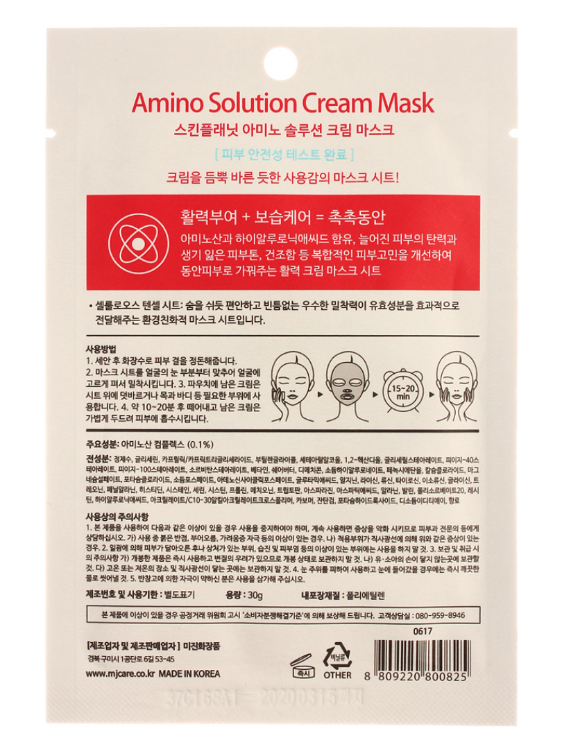 Изготовитель: Изготовитель: MIJIN COSMETICS, Республика Корея, 53-45, 1 Gongdan-ro 6-gil, Gumi-si Gyeongsangbuk-do. Основные компоненты маски - аминокислота и гиалуроновая кислота, обеспечивают уход за проблемной и дряблой кожей, повышают эластичность, устраняют сухость и безжизненный тон, делая кожу молодой, красивой и здоровой. Способ применения: нанести маску на очищенную кожу лица на 10-20 минут.