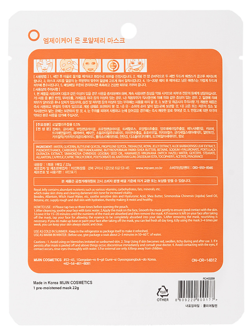 Изготовитель: MIJIN COSMETICS, Республика Корея, 53-45, 1 Gongdan-ro 6-gil, Gumi-si Gyeongsangbuk-do. Маточное молочко богато различными витаминами, углеводами, жирами, неорганическими веществами, которые помогают обрести сияние и жизненный тонус потускневшей и усталой коже. Экстракт солодкового корня, гамамелиса и алантоин успокаивают чувствительную кожу, а гиалуроновая кислота, масло Ши и витамины увлажняют загрубевшую, потерявшую свежесть кожу, смягчают и оздоравливают её. Способ применения:Поместите маску на очищеное лицо. Разглаживайте маску осторожно, чтобы обеспечить хороший контакт с кожей лица по всей площади нанесения. Снимите через 20 минут. Оставшуюся на лице эссенцию аккуратно разгладьте пальцами по косметическим линиям для лучшего впитывания в кожу.