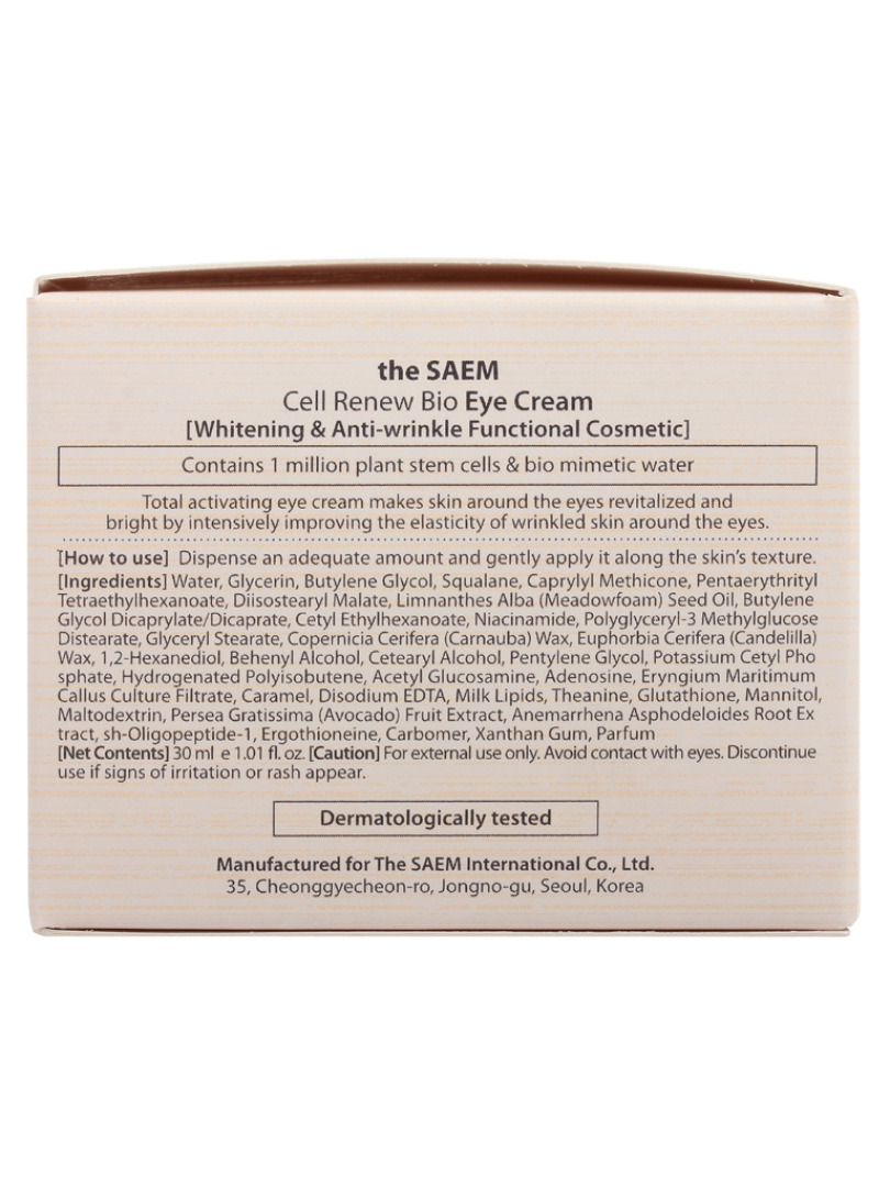 Изготовитель: THE SAEM INTERNATIONAL CO.LTD., КОРЕЯ, РЕСПУБЛИКА, 10F, 35, Cheonggyecheon-ro, Jongno-gu, Seoul. Крем интенсивно увлажняет кожу век, разглаживает морщины, подтягивает кожу, устраняет отечность и темные круги под глазами, осветляет пигментацию, кроме того, крем защищает кожу от агрессивного воздействия УФ-излучения. Способ применения: нанести на очищенную кожу вокруг глаз. Регулярное применение средств линии THE SAEM Cell Renew Bio, позволяет вернуть коже здоровое сияние и замедлить процессы старения.