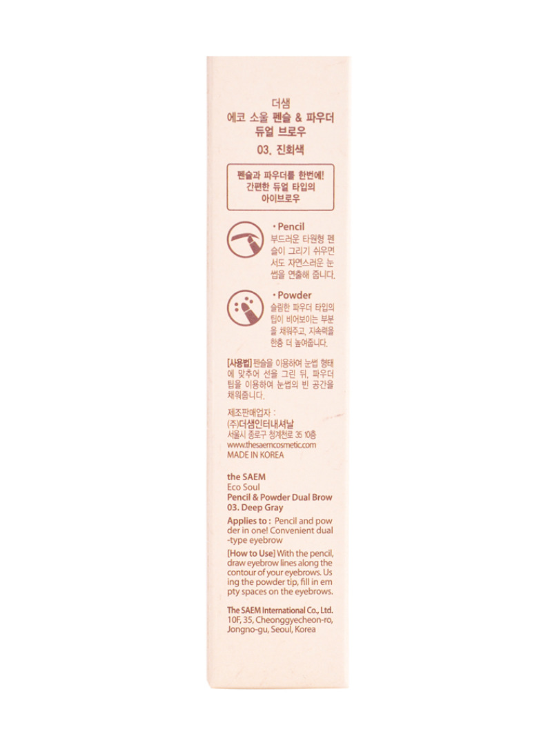 Изготовитель: "THE SAEM INTERNATIONAL CO.LTD"., КОРЕЯ, РЕСПУБЛИКА, 10F, 35, Cheonggyecheon-ro, Jongno-gu, Seoul. Двусторонний карандаш-пудра для бровей. Обладает двойной текстурой – треугольный грифель с натуральным пигментом без труда оставляет четкий контур и естественный оттенок, порошок быстро заполняет пространство между волосками, создавая однородный тон и аккуратную форму бровей. Содержит диоксид кремния, благодаря чему впитывает пот и себум и позволяет дольше сохранить макияж. Карандаш имеет автоматическое выдвижение и аппликатор с другой стороны для нанесения оттеночного порошка. Применение: очертите контур бровей карандашом и заполните внутреннее пространство порошком. Объем: 0,5гр*0,3гр