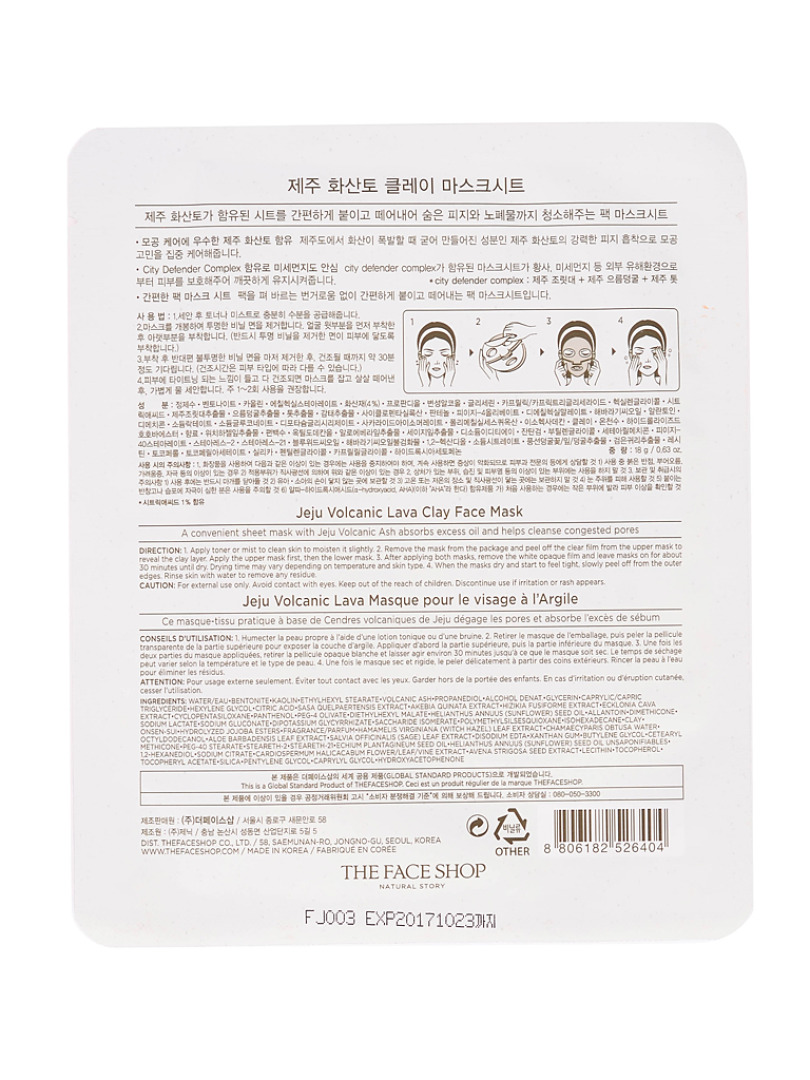 Изготовитель: «THE FACE SHOP CO. LTD. », Южная Корея, 58, Saemunan-ro, Jongno-gu, Seoul. Маска благодаря содержанию вулканической золы острова Чеджу, благодаря чему эффективно ухаживает за жирной кожей, контролирует работу сальных желез, сохраняет чистоту порам и минимизирует их размер, препятствует закупорке пор. Вулканическая зола эффективно восстанавливает минеральный баланс кожи, способствует улучшению кровообращения в тканях. Поддерживает нормальный рН кожи, сохраняет и поддерживает оптимальную увлажненность кожных покровов.
