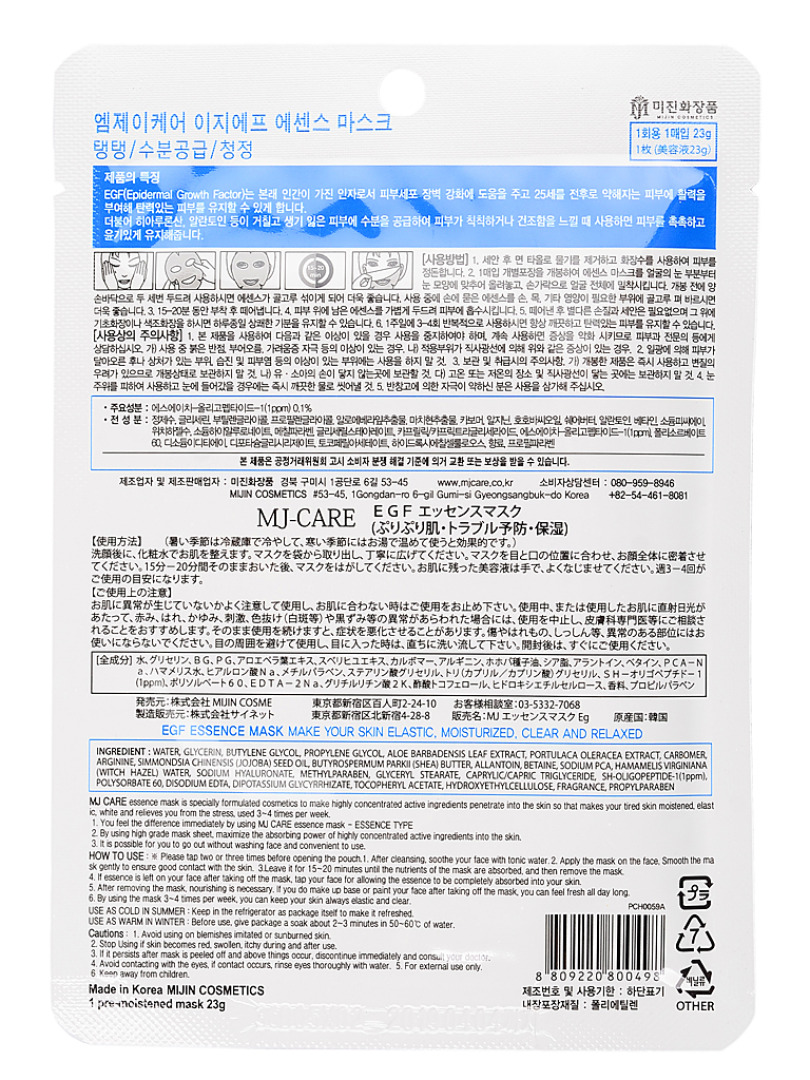Изготовитель: MIJIN COSMETICS, Республика Корея, 53-45, 1 Gongdan-ro 6-gil, Gumi-si Gyeongsangbuk-do. Epidermal Growth Factor (EGF) способствует быстрой регенерации клеток эпидермиса, замедляет процесс старения кожи, способствует обновлению клеток, сохраняет молодость кожи, защищает от повреждений и раздражения, улучшает её цвет и текстуру. Способ применения:Поместите маску на очищеное лицо обеспечив хороший контакт с кожей лица по всей площади нанесения.Снимите через 20 минут. Оставшуюся на лице эссенцию аккуратно разгладьте пальцами по косметическим линиям для лучшего впитывания в кожу. Объем:23гр