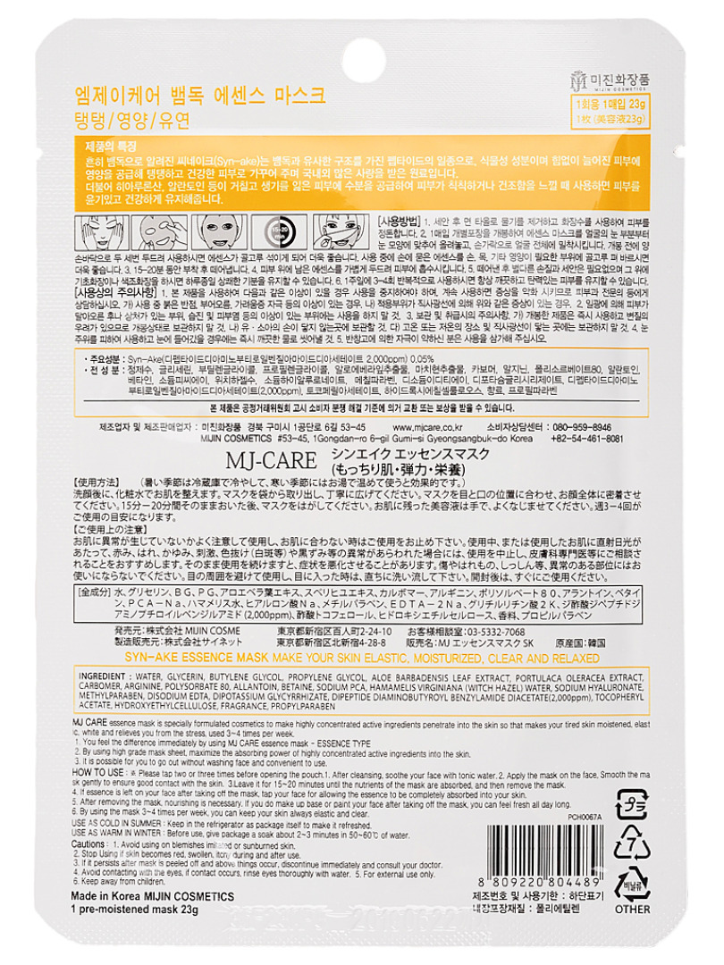 Изготовитель: MIJIN COSMETICS, Республика Корея, 53-45, 1 Gongdan-ro 6-gil, Gumi-si Gyeongsangbuk-do. SYN-AKE – небольшие пептиды, обладающие мимической активностью, сходной с активностью полипептида, обнаруженного в яде Храмовой Гадюки. Маска с веществом SYN-AKE способствует уменьшению мимических морщин, превосходно разглаживает кожу и борется с морщинами. Способ применения: Поместите маску на очищенное лицо обеспечив хороший контакт с кожей лица по всей площади нанесения. Снимите через 20 минут. Оставшуюся на лице эссенцию аккуратно разгладьте пальцами по косметическим линиям для лучшего впитывания в кожу.Объем:23гр