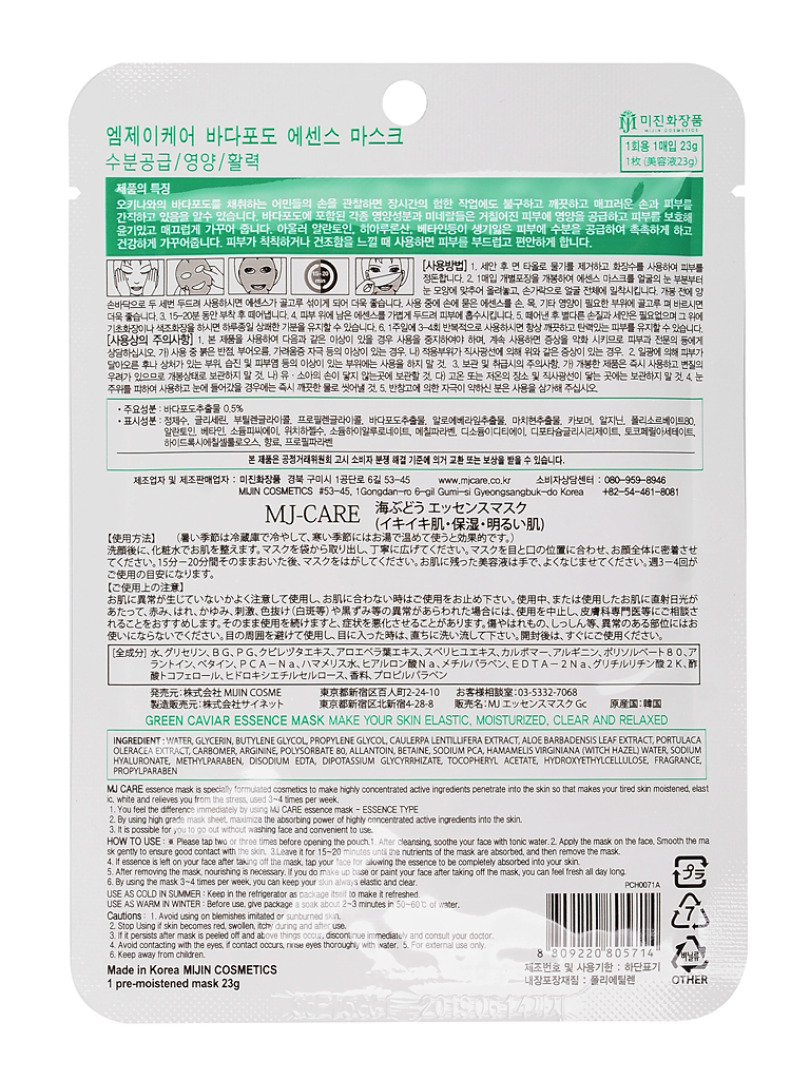 Изготовитель: MIJIN COSMETICS, Республика Корея, 53-45, 1 Gongdan-ro 6-gil, Gumi-si Gyeongsangbuk-do. Маска для лица с экстрактом зеленой икры MJ Care Green Caviar Essence Mask, повышает эластичность кожи, делает контуры лица более чёткими. Тургор кожи улучшается, кожа становится более эластичной. В состав маски также входит: экстракт алоэ, экстракт портулака огородного, аргинин, аллантоин, бетаин, экстракт гамамелиса, гиалуроновая кислота.Способ применения:Поместите маску на очищеное лицо обеспечив хороший контакт с кожей лица по всей площади нанесения.Снимите через 20 минут. Оставшуюся на лице эссенцию аккуратно разгладьте пальцами по косметическим линиям для лучшего впитывания в кожу. Объем:23гр