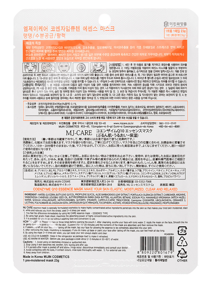 Изготовитель: MIJIN COSMETICS, Республика Корея, 53-45, 1 Gongdan-ro 6-gil, Gumi-si Gyeongsangbuk-do. Маска содержит коэнзим Q10, который оказывают лифтинговый эффект, активно разглаживает существующие и снижает вероятность появления новых морщин, помогает восстанавливать эластичность и возвращает Вашей коже молодость.Способ применения:Поместите маску на очищеное лицо обеспечив хороший контакт с кожей лица по всей площади нанесения.Снимите через 20 минут. Оставшуюся на лице эссенцию аккуратно разгладьте пальцами по косметическим линиям для лучшего впитывания в кожу. Объем:23гр