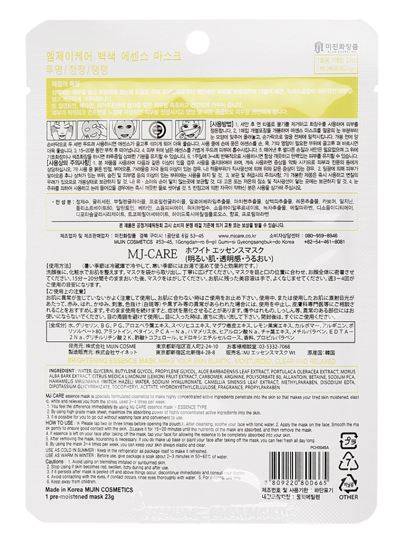 Изготовитель: MIJIN COSMETICS, Республика Корея, 53-45, 1 Gongdan-ro 6-gil, Gumi-si Gyeongsangbuk-do. В состав маски входят экстракты коры шелковицы белой, лимона и зеленого чая, которые помогают избавиться от пигментации на лице, осветляют, выравнивая цвет и поверхность кожи. Аллантоин, гамамелис, бетаин и гиалуроновая кислота превосходно успокаивают и увлажняют чувствительную кожу. Способ применения: Поместите маску на очищеное лицо обеспечив хороший контакт с кожей лица по всей площади нанесения. Снимите через 20 минут. Оставшуюся на лице эссенцию аккуратно разгладьте пальцами по косметическим линиям для лучшего впитывания в кожу. Объем: 23 гр