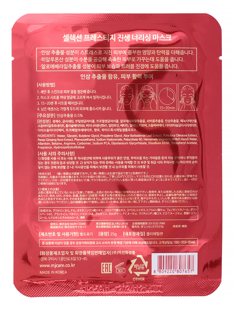 Изготовитель: MIJIN COSMETICS, Республика Корея, 53-45, 1 Gongdan-ro 6-gil, Gumi-si Gyeongsangbuk-do. Тканевые маски с высококачественными активными компонентами обеспечивают профессиональный уход за кожей лица – оказывают эффективный антивозрастной уход и сохраняют молодость кожи. Рецептура эссенции маски способствует более глубокому проникновению активных ингредиентов, увлажнению и питанию кожи. Все маски содержат гиалуроновую кислоту для интенсивного увлажнения кожи.Маска с экстрактом красного женьшеня активно питает, увлажняет и подтягивает кожу, ускоряет регенерацию, тонизирует, стимулирует синтез собственного коллагена. Будет эффективна для зрелой, тусклой, обезвоженной и подверженной стрессам кожи. В составе алоэ, масла жожоба и ши. Способ применения: На предварительно очищенную и тонизированную кожу лица нанести маску, аккуратно разгладив и распределив ее. Оставить маску на 15-20 минут. Остатки невпитавшейся эссенции вмассировать в кожу легкими движениями.