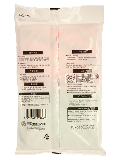 Изготовитель: «Sung Bo Cleamy Co., Ltd. », Южная Корея, 225, Galgogri, Bobwonub, Paju, Geonggi Do. Губка-скраббер для мытья посуды. Наличие губки улучшает пенообразование, помогая снизить расход средств для мытья посуды.