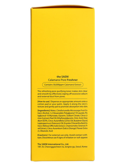 Изг-ль: THE SAEM INTERNATIONAL CO.LTD., КОРЕЯ, РЕСПУБЛИКА, 10F, 35, Cheonggyecheon-ro, Jongno-gu, Seoul. Средство насыщенно витамином С и синефурином, содержащимся в экстракте каламанси. Линия для эффективного ухода за жирной кожей, контролирует работу сальных желез, восстанавливает гладкость эпидермиса, способствует сохранению свежести и яркости тона. Интенсивная терапия для кожи, склонной к появлению расширенных пор и угрей, восстановление свежести и мягкости кожи. Также препятствует появлению обезвоживания жирной кожи. Способ применения: нанесите небольшое количество тонера на ватный диск и мягко протрите кожу лица.