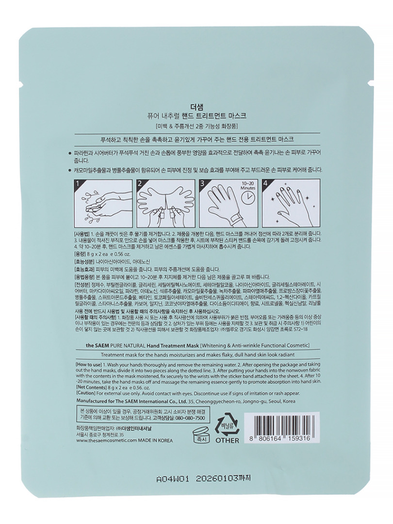 Изг-ль: "THE SAEM INTERNATIONAL CO.LTD.", КОРЕЯ, РЕСПУБЛИКА, 10F, 35, Cheonggyecheon-ro, Jongno-gu, Seoul. Увлажняющая маска для кожи рук предназначена для восстановления эластичности и упругости кожи, сохранения витаминного баланса и оптимального уровня увлажнения. Способствует предохранению кожи от возникновения сухих трещин и шелушения. Способ применения: на чистые, сухие руки надеть перчатки, закрепить стикером. Оставить на 10-20 мин, оставшуюся эссенцию распределить по коже.