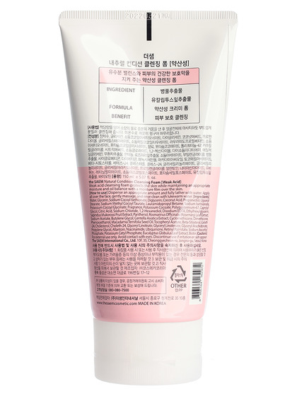 Изготовитель: "THE SAEM INTERNATIONAL CO.LTD.", КОРЕЯ, РЕСПУБЛИКА, 10F, 35, Cheonggyecheon-ro, Jongno-gu, Seoul. Очищающая пенка Natural Condition Cleansing Foam Weak acid. Она разработана специально для ухода за чувствительной кожей и имеет способность создавать защитный барьер. В её составе активные компоненты растительного происхождения, которые активно используются в косметологии: экстракт аморфофаллуса, экстракт мяты, гиалуроновая кислота и экстракт гамамелиса, керамиды. Пенка защищает кожу от негативного воздействия на протяжении целого дня и очень экономична в использовании.