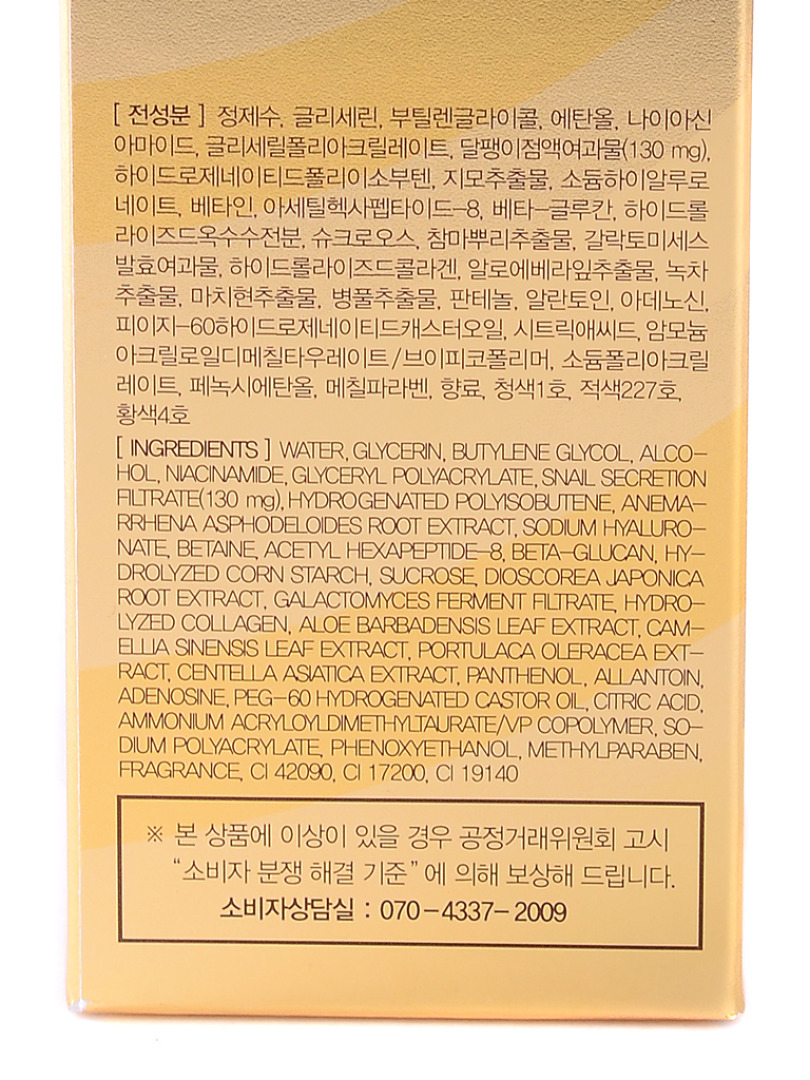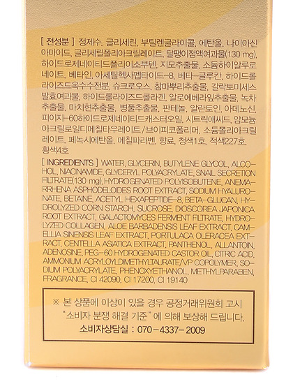 Water,snail secretion filtrate,glycerin,butylene glycol,alcohol,niacinamide,sodium hyaluronate,glyceryl polyacrylate,beta-glucan,hydrolyzed corn starch,sodium chondroitin sulfate,sclerotium gum,sucrose,dioscorea japonica root extract,betaine,acetyl hexapeptide-8,galactomyces ferment filtrate,hydrolyzed collagen,aloe barbadensis leaf extract ,camellia sinensis leaf extract,portulaca oleracea extract ,centella asiatica extract,panthenol,allantoin,adenosine,peg-60 hydrogenated castor oil,citric acid, ammonium acryloyldimethyltaurate/vp copolymer,sodium polyacrylate,phenoxyethanol,methylparaben, fragrance , ci 42090 , ci 17200 , ci 19140