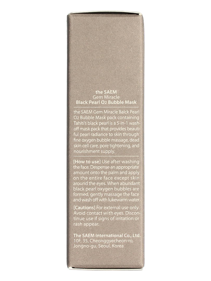 Изготовитель: «THE SAEM INTERNATIONAL CO.LTD. », КОРЕЯ, РЕСПУБЛИКА, 10F, 35, Cheonggyecheon-ro, Jongno-gu, Seoul. Кислородная маска с экстрактом черного жемчуга. Маска помогает повысить эластичность кожи, улучшить циркуляцию крови, обогатить верхние слоя кожи кислородом, а также осветлить тон лица и пигментные пятна. При нанесении превращается в воздушную пену, которая проникает в поры и выталкивает загрязнения с поверхности кожи. Использование: нанесите маску на чистую кожу. Подождите 10 секунд, пока не образуется обильная пенка. Подождите еще 10 секунд, пока пенка полностью растворится. Смойте остатки вещества теплой водой и продолжите ежедневный уход.