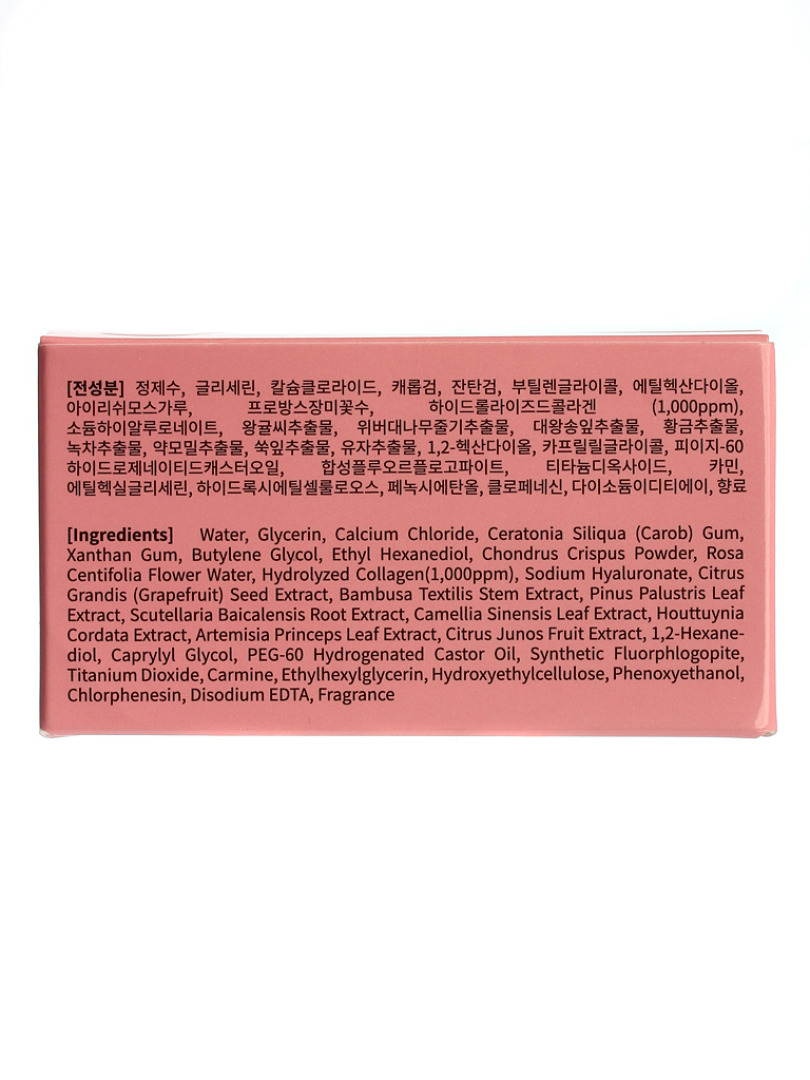 Water, Glycerin, Calcium Chloride, Ceratonia Siliqua (Carob) Gum, Xanthan Gum, Butylene Glycol, Ethyl Hexanediol, Chondrus Crispus Powder, Rosa Centifolia Flower Water, Hydrolyzed Collagen(1,000ppm), Sodium Hyaluronate, Citrus Grandis (Grapefruit) Seed Extract, Bambusa Textilis Stem Extract, Pinus Palustris Leaf Extract, Scutellaria Baicalensis Root Extract, Camellia Sinensis Leaf Extract, Houttuynia Cordata Extract, Artemisia Princeps Leaf Extract, Citrus Junos Fruit Extract, 1,2-Hexane- diol, Caprylyl Glycol, PEG-60 Hydrogenated Castor Oil, Synthetic Fluorphlogopite Titanium Dioxide, Carmine, Ethylhexylglycerin, Hydroxyethylcellulose, Phenoxyethanol, Chlorphenesin, Disodium EDTA, Fragrance