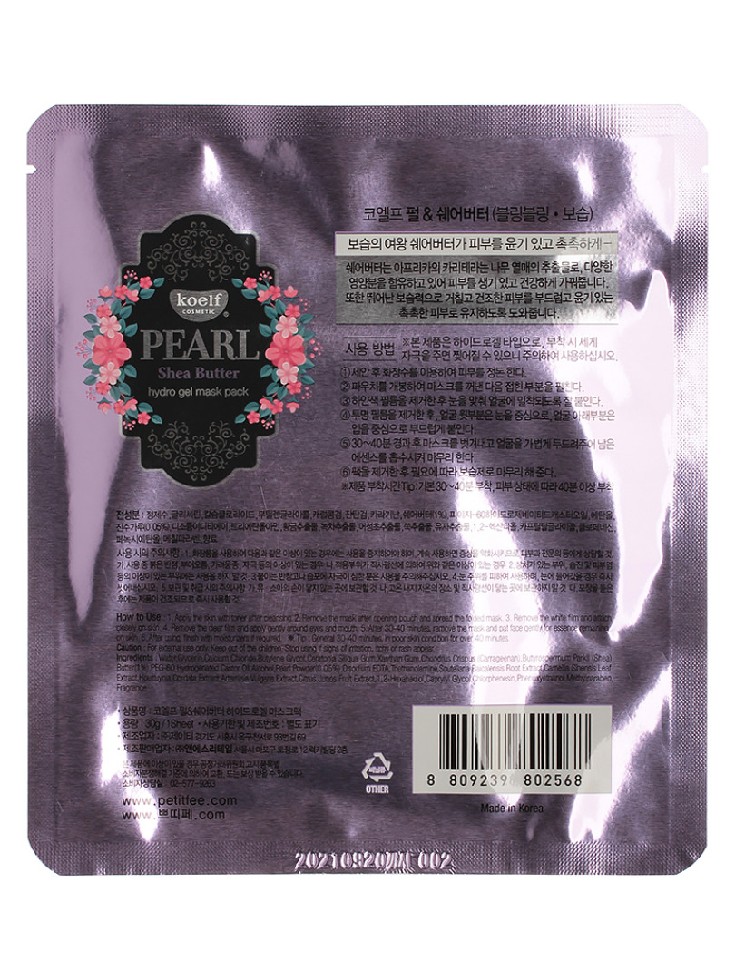 Изготовитель: NS RETAL CO., LTD., Корея, Республика, 2F, Lucky Building, 12, Tojeong-ro, Mapo-gu, Seoul. Гидрогель представляет собой легкоусвояемую форму косметических средств – он плотно прилегает к коже, размягчая и насыщая ее влагой, а активные компоненты гидрогелевой основы быстрее усваиваются, проникая в дерму. В составе гидрогелевой маски содержится масло ши, которое восстанавливает липидный барьер кожи и обеспечивает пролонгированное увлажнение и антиоксидантную защиту. Жемчужная пудра – еще один активный компонент маски, способствует разглаживанию и осветлению кожи, снабжает ее клетки биодоступным кальцием и убирает следы усталости. Помимо минеральных компонентов жемчуг содержит аминокислоты, необходимые для процессов биосинтеза. Желейная текстура маски способствует более плотному контакту и равномерному распределению полезных веществ.