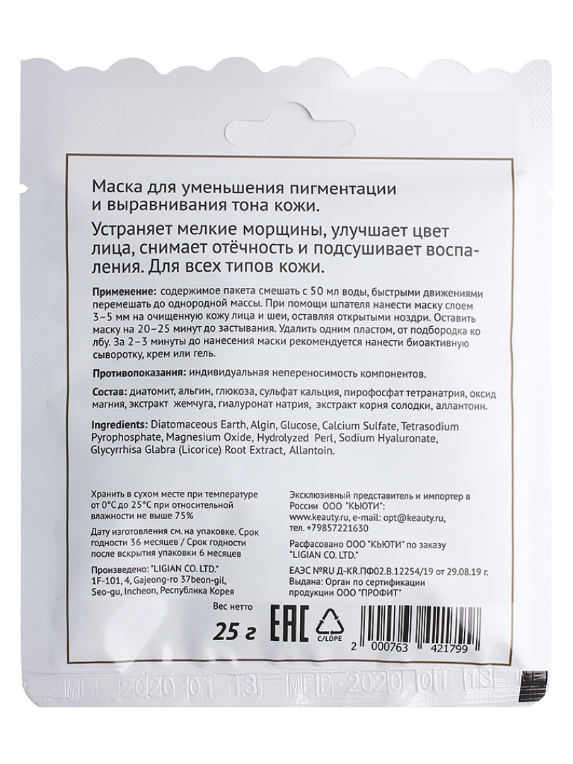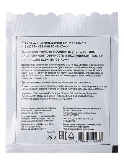 Изг-ль: LIGIAN Co.Ltd., КОРЕЯ, РЕСПУБЛИКА, 1F-101, 4, Gajeong-ro 37beon-gil, Seo-gu, Incheon. Активирует кровоток, ускоряет регенерацию клеток, противостоит появлению тусклого тона, скоплению меланина на поверхности кожи, осветляет веснушки и кожные пятна. Положить порошок мерной чашкой и воду (или активатор) в миску в соотношении на 100 мл порошка 80 мл воды, быстрыми движениями перемешайте до однородной массы при помощи шпателя. При помощи шпателя нанесите маску слоем 3-5 мм на очищенную кожу лица, оставляя открытыми только ноздри. Оставить маску на 20-25 минут до застывания. Удалить её одним пластом, от подбородка ко лбу.