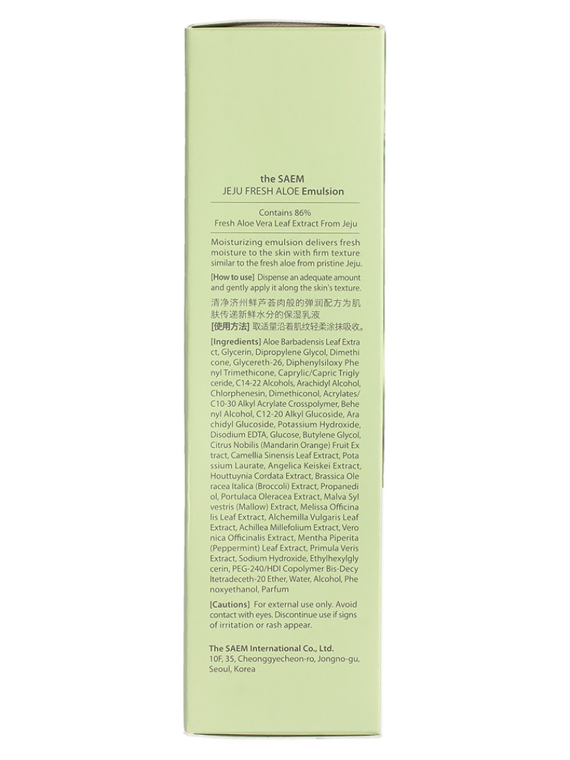 Изг-ль: THE SAEM INTERNATIONAL CO.LTD., КОРЕЯ, РЕСПУБЛИКА, 10F, 35, Cheonggyecheon-ro, Jongno-gu, Seoul. Эмульсия глубоко увлажняет кожу и повышает её эластичность. Увлажняющая эмульсия защищает кожу от воздействия окружающей среды. Эмульсия содержит 86% алоэ, подходит для ухода за любым типом кожи, особенно для сухой и чувствительной. Оказывает интенсивное увлажняющее действие, освежает и успокаивает кожу, способствует заживлению различных раздражений, устраняет сухость и шелушения. Способ применения: нанести средство на ватный диск и протереть им кожу после тоника.