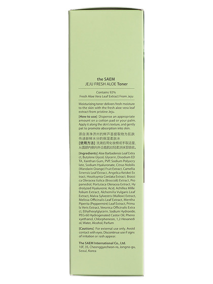 Изг-ль: THE SAEM INTERNATIONAL CO.LTD., КОРЕЯ, РЕСПУБЛИКА, 10F, 35, Cheonggyecheon-ro, Jongno-gu, Seoul. Тонер глубоко увлажняет кожу, сужает поры и повышается её эластичность. Тонер защищает кожу от воздействия окружающей среды. Содержащийся в алоэ лигнин помогает проникновению ферментов и влаги в глубокие слои кожи, стимулирует обменные процессы и способствует обновлению клеток кожи. Способ применения: нанести на тщательно очищенную и сухую кожу при помощи ватного диска или кончиками пальцев.