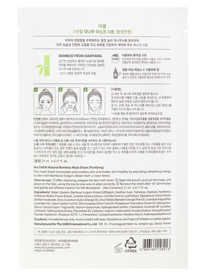 Изготовитель: THE SAEM INTERNATIONAL CO.LTD., КОРЕЯ, РЕСПУБЛИКА, 10F, 35, Cheonggyecheon-ro, Jongno-gu, Seoul. Тканевая маска на основе экстракта бамбука мгновенно стабилизирует липидный баланс кожи и предотвращает пересыхание. Моментально впитывается в кожу, обеспечивая надежную защиту от ветра, холода, УФ-лучей и других внешних агрессоров. Обладает ранозаживляющими свойствами, прекрасно питает и стимулирует клеточный метаболизм. Воздействуя на верхний кожный слой, великолепно разглаживает его и придает шелковистость. Экстракт бамбука уменьшает отеки, подтягивает кожу, повышает ее эластичность, тонизирует, способствует удержанию влаги в коже, усиливает ее питание, выравнивает рельеф кожи, борется с ее дряблостью и усталостью, куперозом, регулирует обменные процессы в коже, предотвращает появление морщин, растяжек, отеков. Мягкая, тонкая текстура маски, как шелк, из натуральных ингредиентов плотно прилегает к коже, придавая мягкое ощущение. Применение: очистите кожу тоником и приложите маску, оставьте на 15-20 минут. Оставшуюся жидкость вмассируйте.