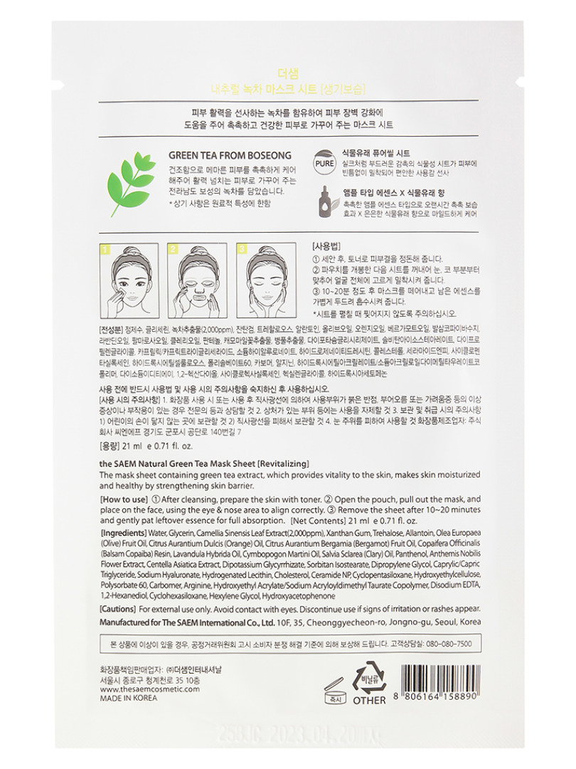Изготовитель: THE SAEM INTERNATIONAL CO.LTD., КОРЕЯ, РЕСПУБЛИКА, 10F, 35, Cheonggyecheon-ro, Jongno-gu, Seoul. Основное действие зеленого чая - стимулирующее, противовоспалительное. Танины зеленого чая обладают способностью повышать устойчивость кровеносных капилляров. Содержит также проантоцианидины, действующие как антиоксидант. Экстракт зеленого чая интенсивно питает и увлажняет кожу, улучшает структуру эпидермиса и укрепляет тонус кожи. Экстракт очищает поры, ликвидирует сухость кожи, стимулирует клеточную деятельность, снимает усталость и препятствует процессу старения, усиливает защитные функции кожи. Мягкая, тонкая текстура маски, как шелк, из натуральных ингредиентов плотно прилегает к коже, придавая мягкое ощущение. Применение: приложите маску к очищенной коже, плотно прижмите коже и оставьте на 20-25 минут. После распределите остатки жидкости по коже лица и шее.
