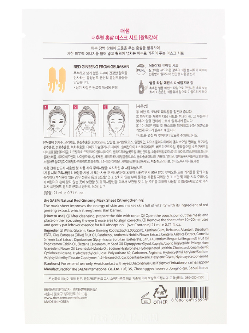 Изготовитель: THE SAEM INTERNATIONAL CO.LTD., КОРЕЯ, РЕСПУБЛИКА, 10F, 35, Cheonggyecheon-ro, Jongno-gu, Seoul. Тканевая маска для лица не раздражает кожу и сохраняет влагу на протяжении длительного времени. Красный женьшень активизирует обмен веществ в клетках кожи, увлажняет и питает. Способствует регенерации кожи и улучшает микроциркуляцию. Придает мягкость и упругость, разглаживает морщины. Обладает антибактериальным действием, регулирует работу сальных желез, выравнивает рН баланс кожи. Способ применения: наложить на очищенное лицо на 20-30 мин. Затем снять маску, похлопывающими движениями помассировать лицо до полного впитывания маски.