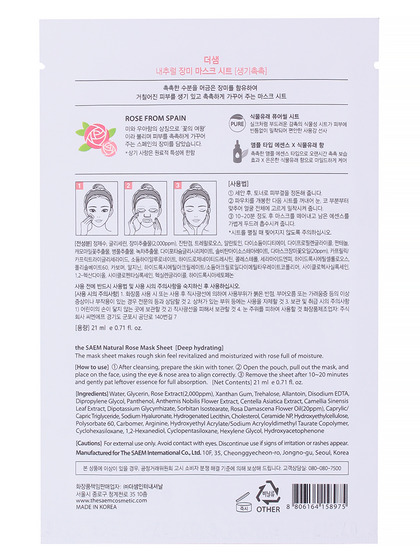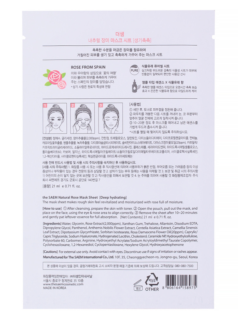 Изготовитель: THE SAEM INTERNATIONAL CO.LTD., КОРЕЯ, РЕСПУБЛИКА, 10F, 35, Cheonggyecheon-ro, Jongno-gu, Seoul. Тканевая маска из серии Natural содержит экстракт розы 1,000 мг, треrалозу и т.д. Поддерживает эластичность и упругость, способствует сохранению мягкости эпидермиса. Придает коже здоровое сияние. Треrалоза обладает уникальной способностью защищать и поддерживать жизнедеятельность клеток при неблагоприятном воздействии окружающей среды. Она компенсирует недостаток влажности кожи, сохраняет их клеточную структуру и предохраняет от повреждений. Способна подавлять образование летучих альдегидов, связанных со старением. Она задерживает процесс разложения жирной кислоты. Экстракт розы омолаживает, регенерирует, разглаживает, повышает эластичность и упругость кожи, придает ровный и красивый цвет коже. Восстанавливают эластичность увядающей, морщинистой, усталой кожи. Увлажняет сухую, обезвоженную кожу. Листовая маска содержит воздушные карманы, что делает более эффективным передачу питательных веществ коже. Применение: приложите маску к очищенной коже, плотно прижмите коже и оставьте на 20-25 минут. После распределите остатки жидкости по коже лица и шее.