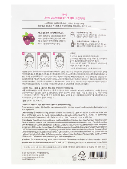 Изготовитель: THE SAEM INTERNATIONAL CO.LTD., КОРЕЯ, РЕСПУБЛИКА, 10F, 35, Cheonggyecheon-ro, Jongno-gu, Seoul. Тканевая маска из серии Natural содержит экстракт асаи (2000мг), трегалоза, аллантоин, пантенол и т.д., обладает натуральным, мягкий ароматом. Экстракт плодов асаи содержит большое количество антоцианов, флавоноидов и ресвератрол и действует как антиоксидант, который помогает бороться против появления морщин. Омолаживает, обеспечивает питание и проявляет выраженные увлажняющие свойства. Гладкий, тонкий лист маски плотно прилегает к коже, мягко воздействует на нее, не вызывая раздражения. Применение: приложите маску к очищенной коже, плотно прижмите коже и оставьте на 20-25 минут. После распределите остатки жидкости по коже лица и шее. Объем: 21мл