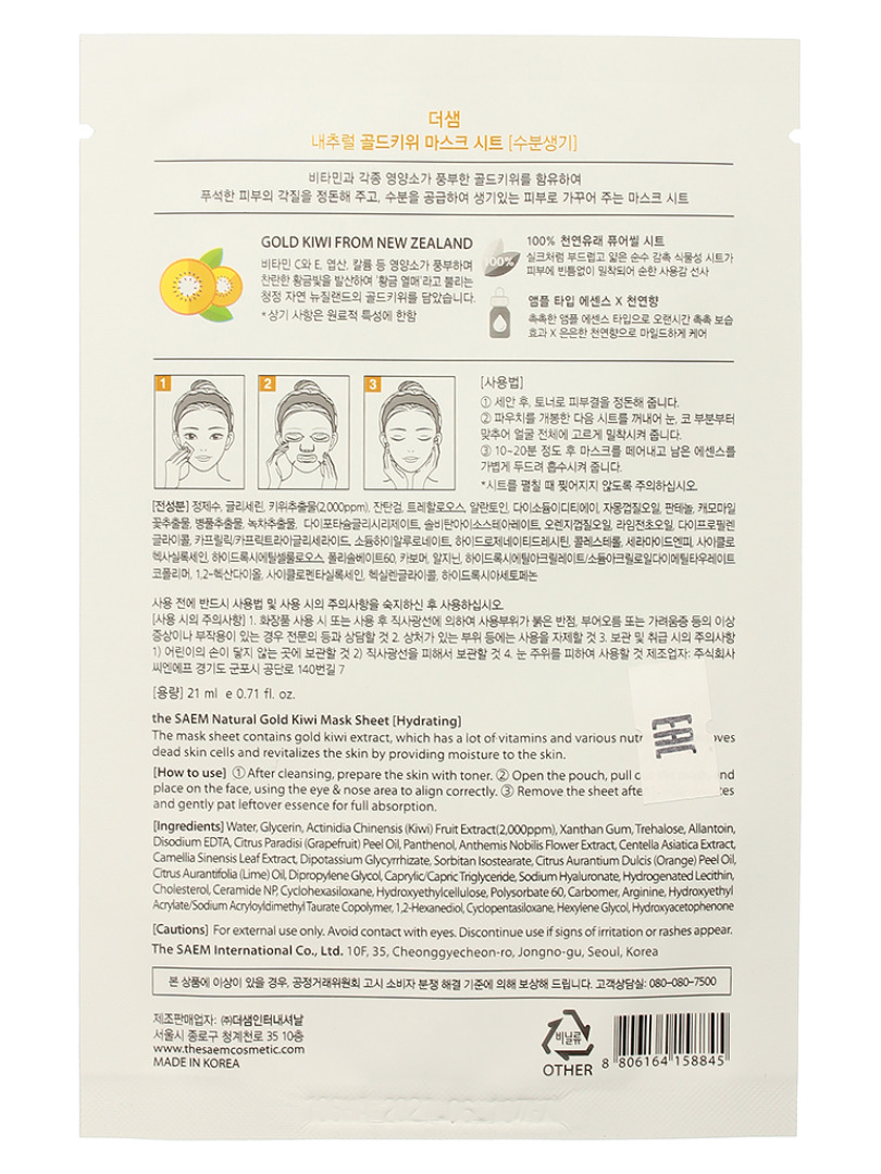 Изготовитель: THE SAEM INTERNATIONAL CO.LTD., КОРЕЯ, РЕСПУБЛИКА, 10F, 35, Cheonggyecheon-ro, Jongno-gu, Seoul. Тканевая маска из серии Natural содержит экстракт золотого киви (2000 мг). Экстракт золотого киви восстанавливает и стимулирует обновление клеток. Предотвращает обезвоживание, сухость и повреждения, которые могут быть вызваны солнечными лучами. Маска отшелушивает старые клетки, придает коже яркость и поддерживает оптимальное увлажнение. Применение: приложите маску к очищенной коже, плотно прижмите коже и оставьте на 20-25 минут. После распределите остатки жидкости по коже лица и шее.